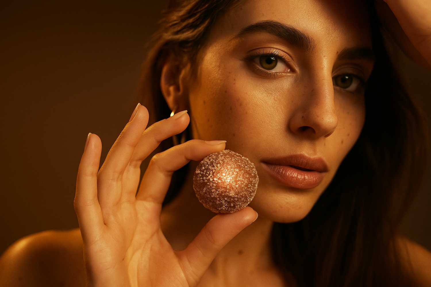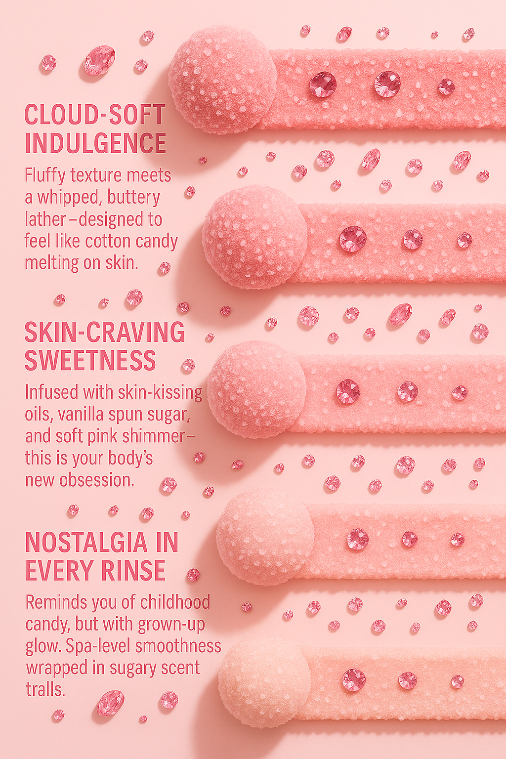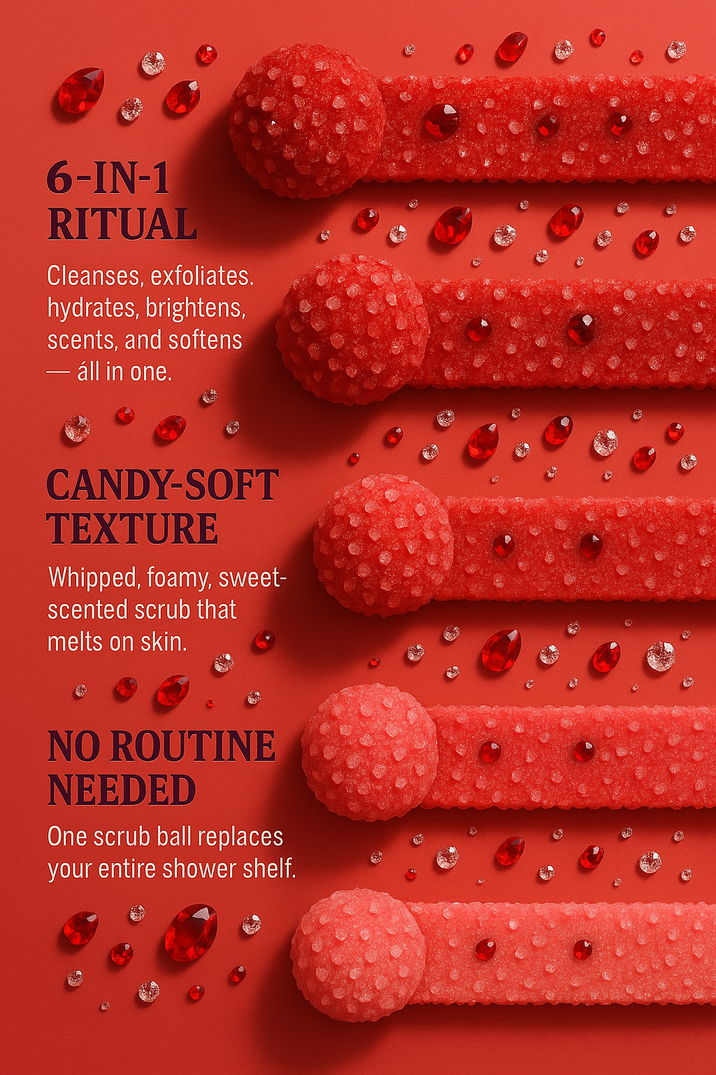 Unwrap the scrub ball and inhale its edible-sweet scent. Let water kiss it, then melt it between your palms into a whipped, creamy lather. Massage the velvet foam over your body—pause as the aroma floods your senses. Rinse to reveal a baby-soft, glazed glow. Your whole routine, in one melt-on moment.